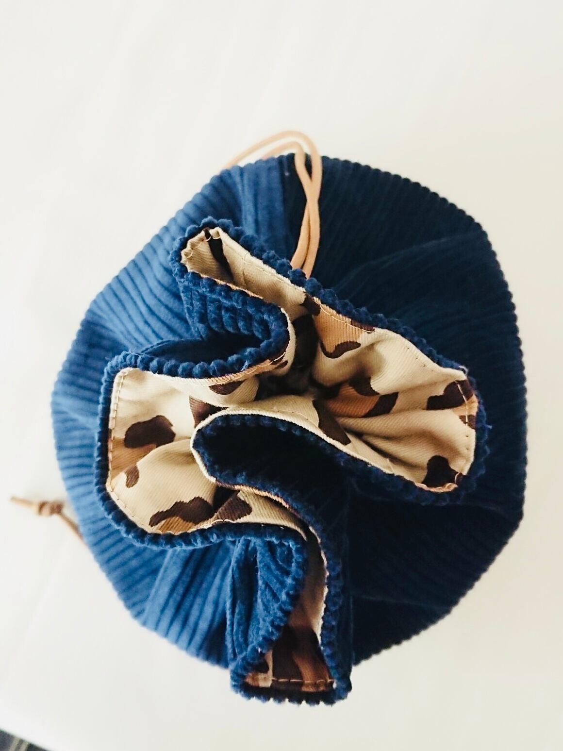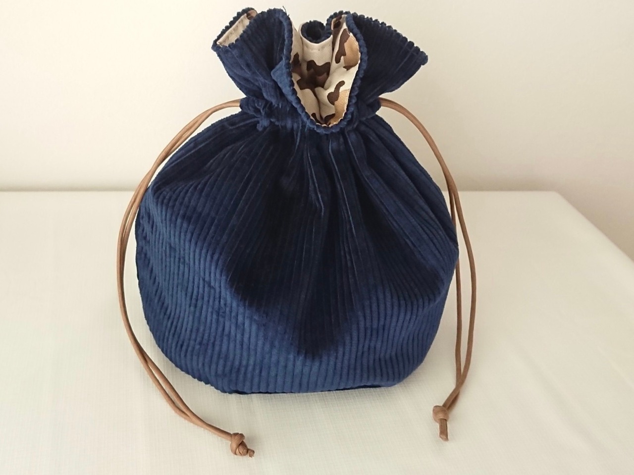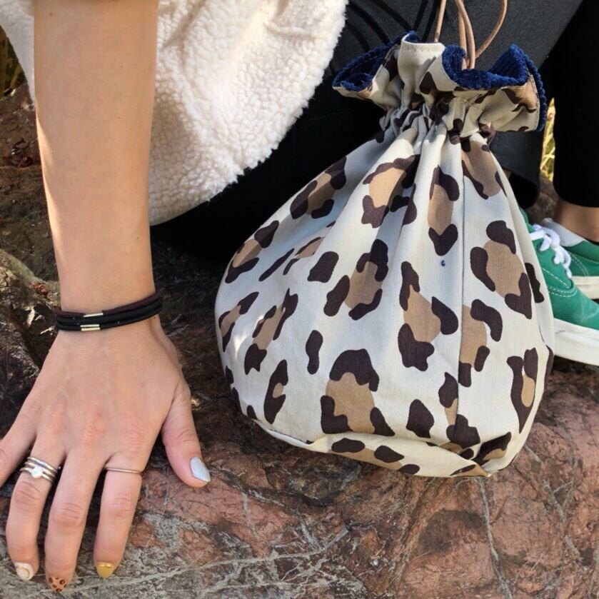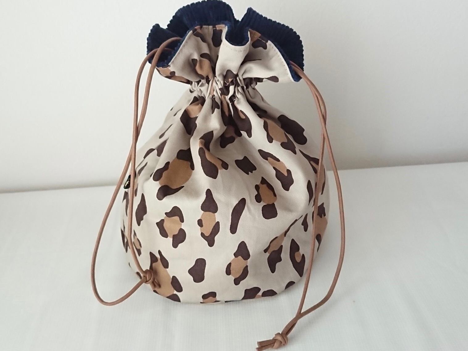 ネイビーコーデュロイ×ベージュレオパード巾着