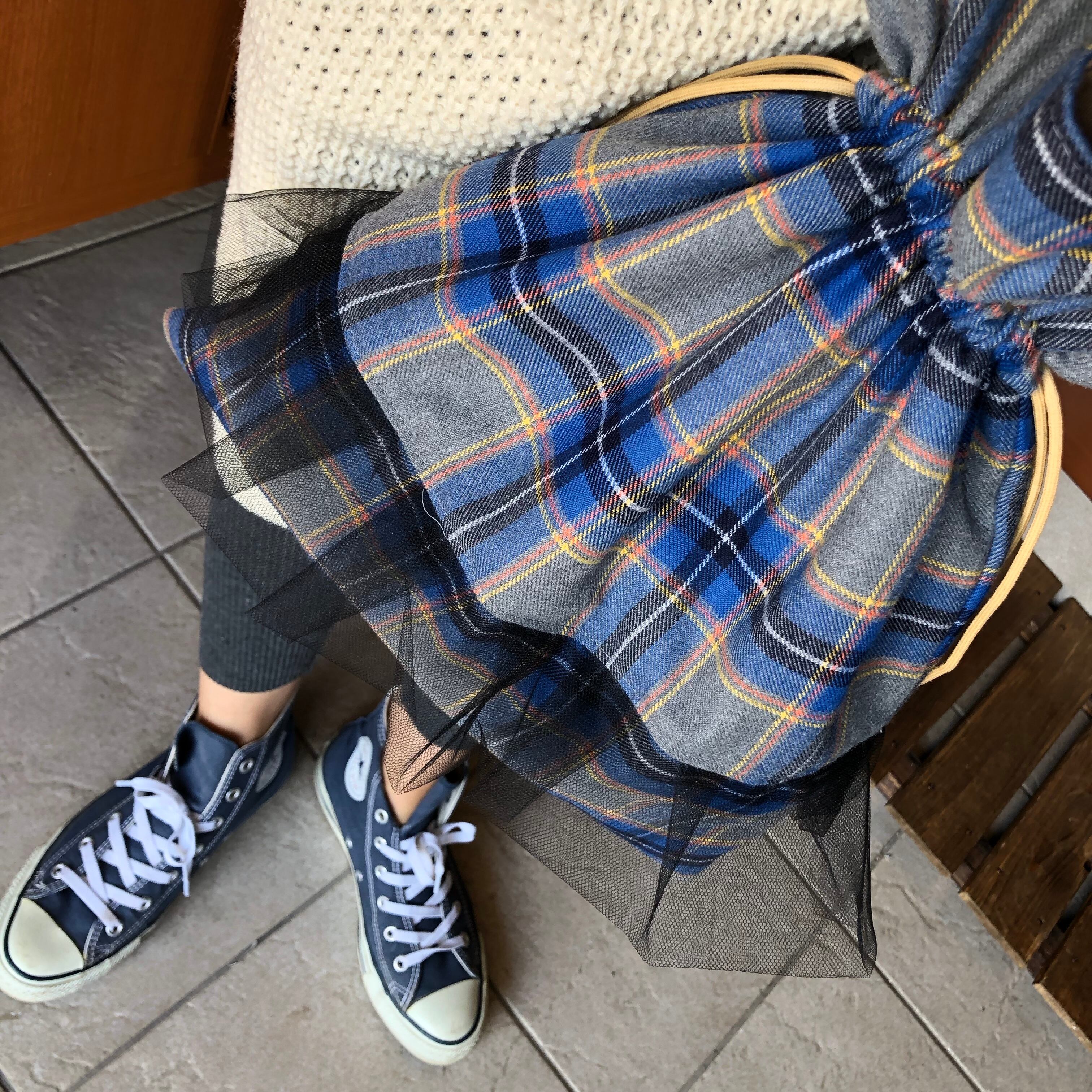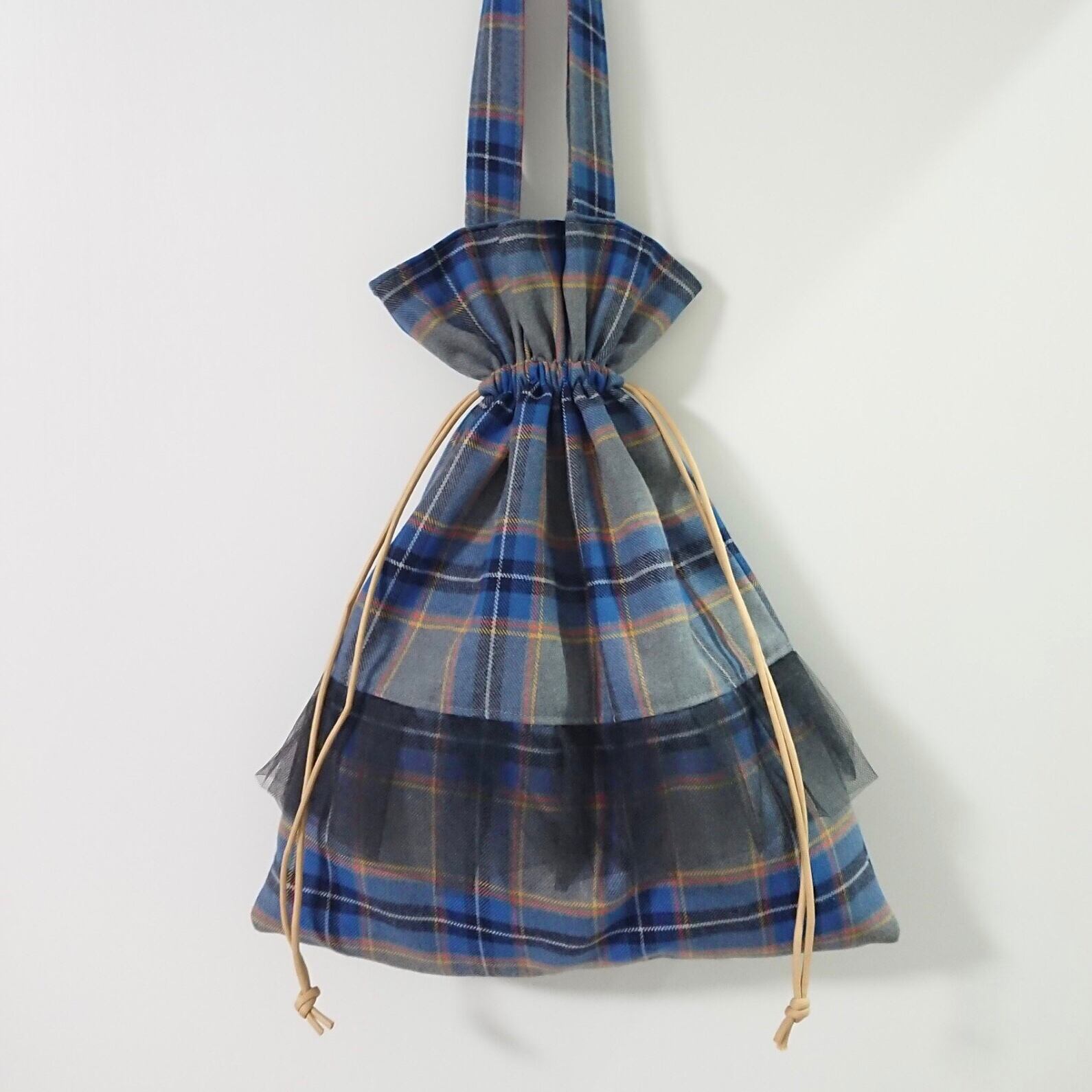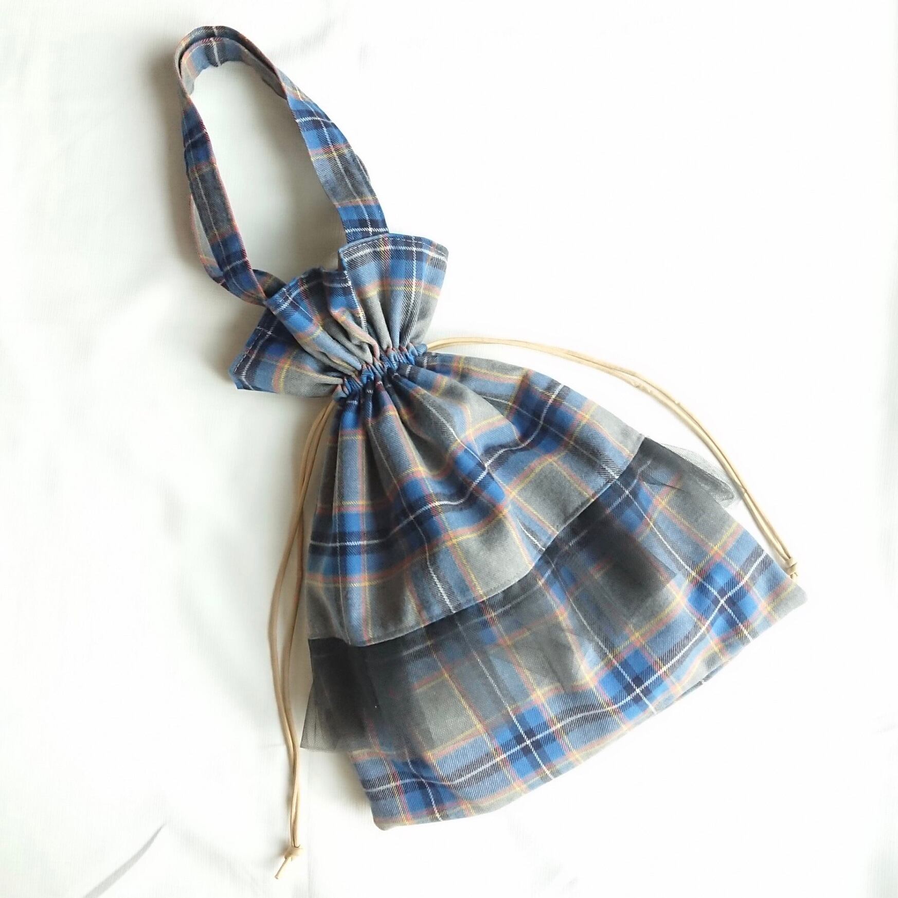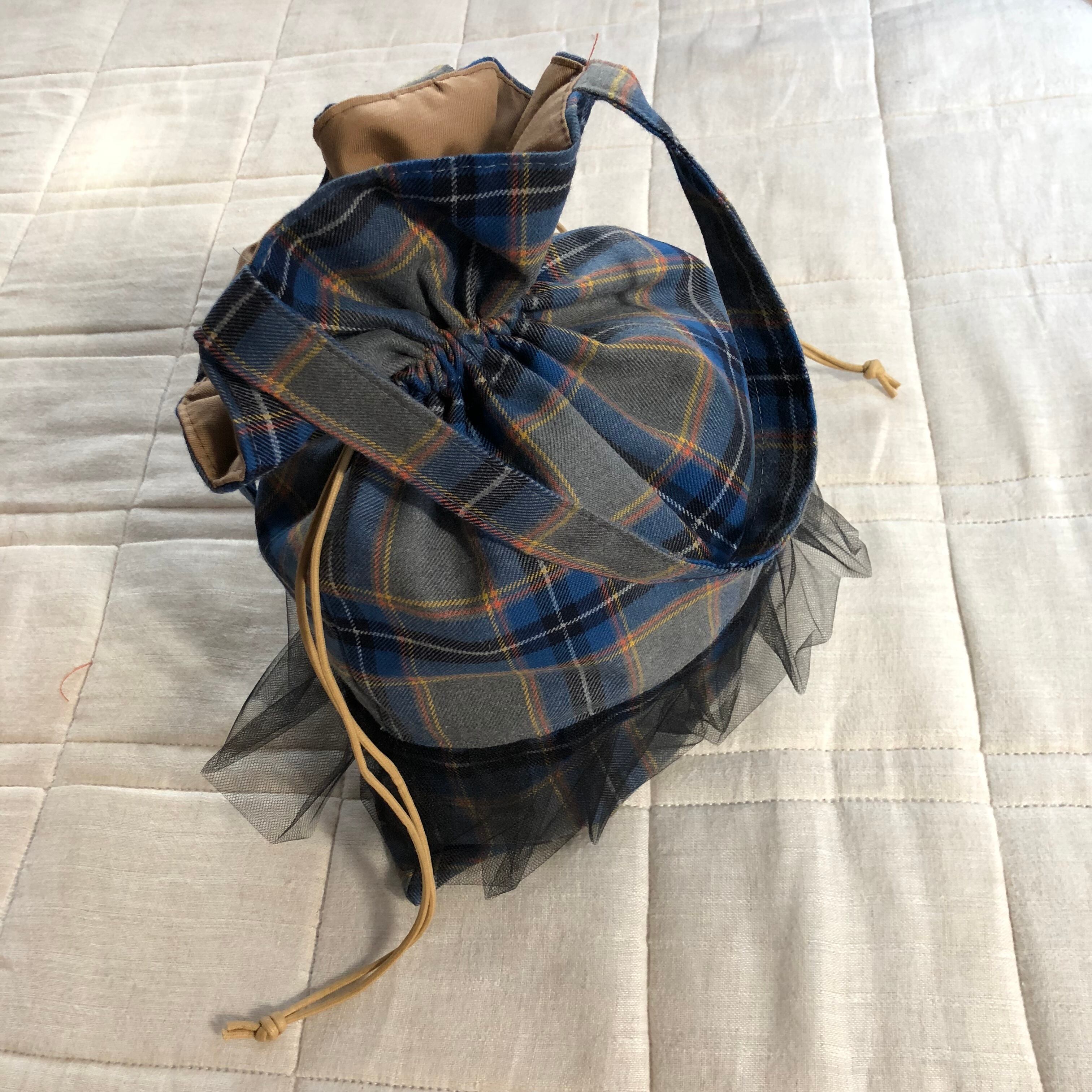 ウールチェック×チュール巾着