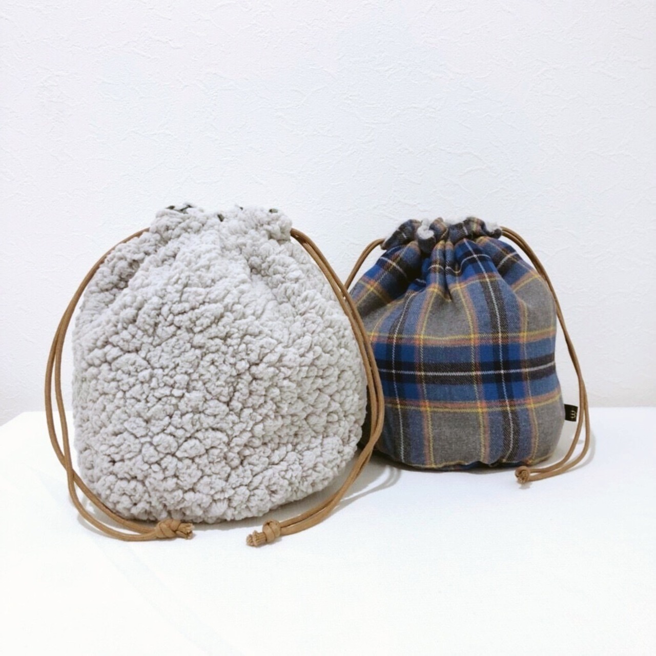 ライトグレーボア×ブルーチェック巾着