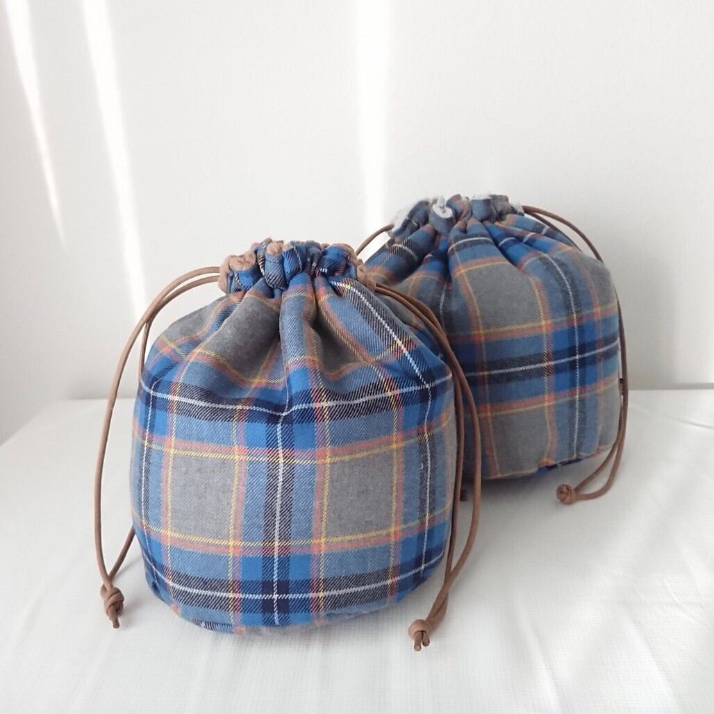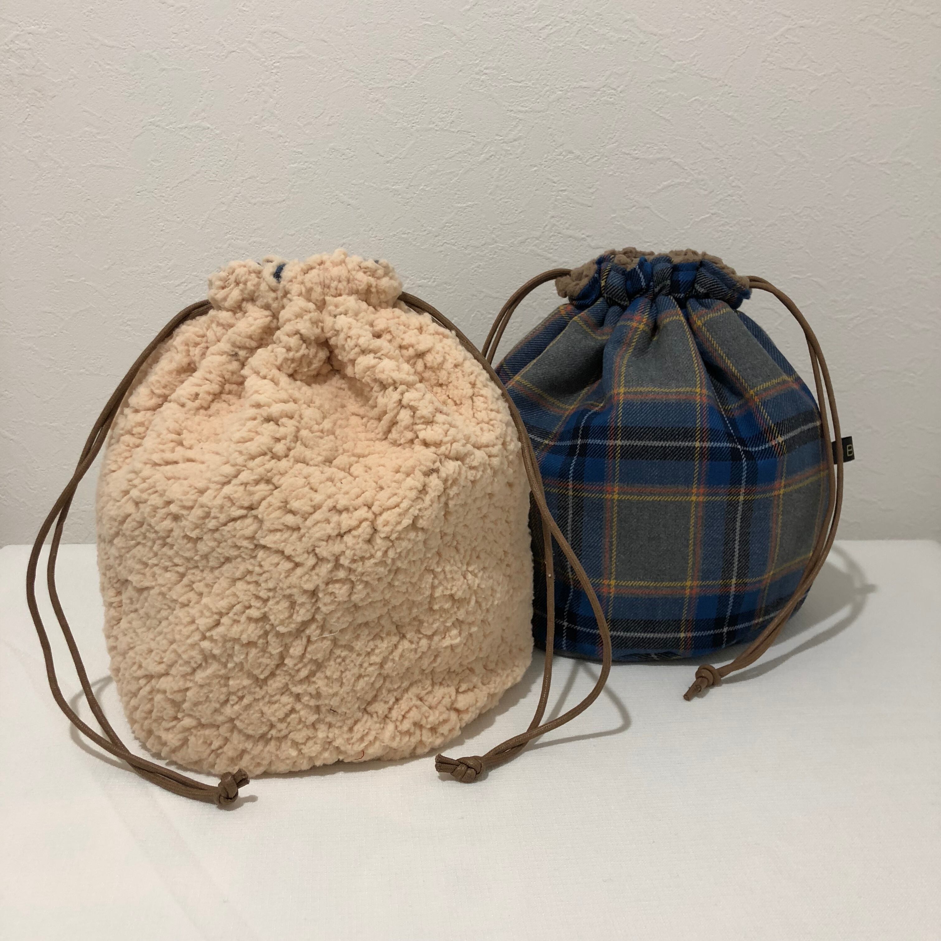 ベージュボア×ブルーチェック巾着