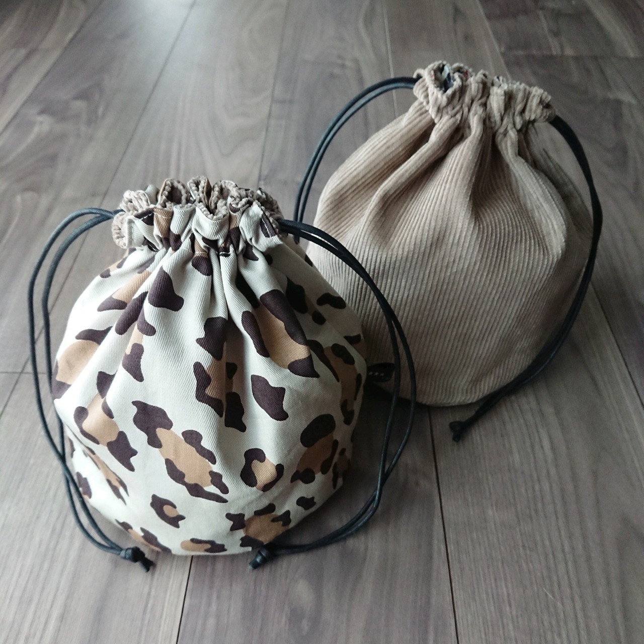 リバーシブル丸底巾着 ベージュレオパ