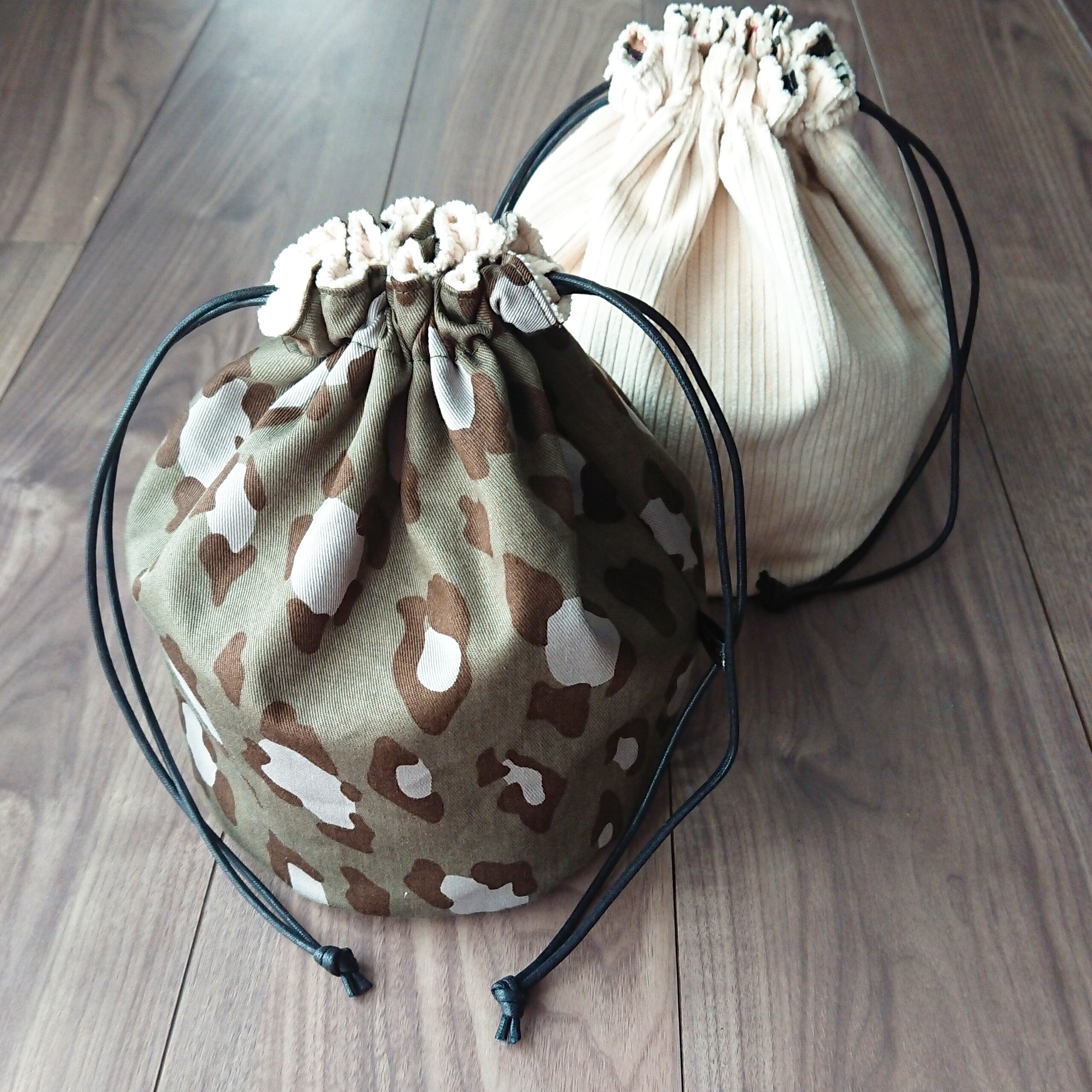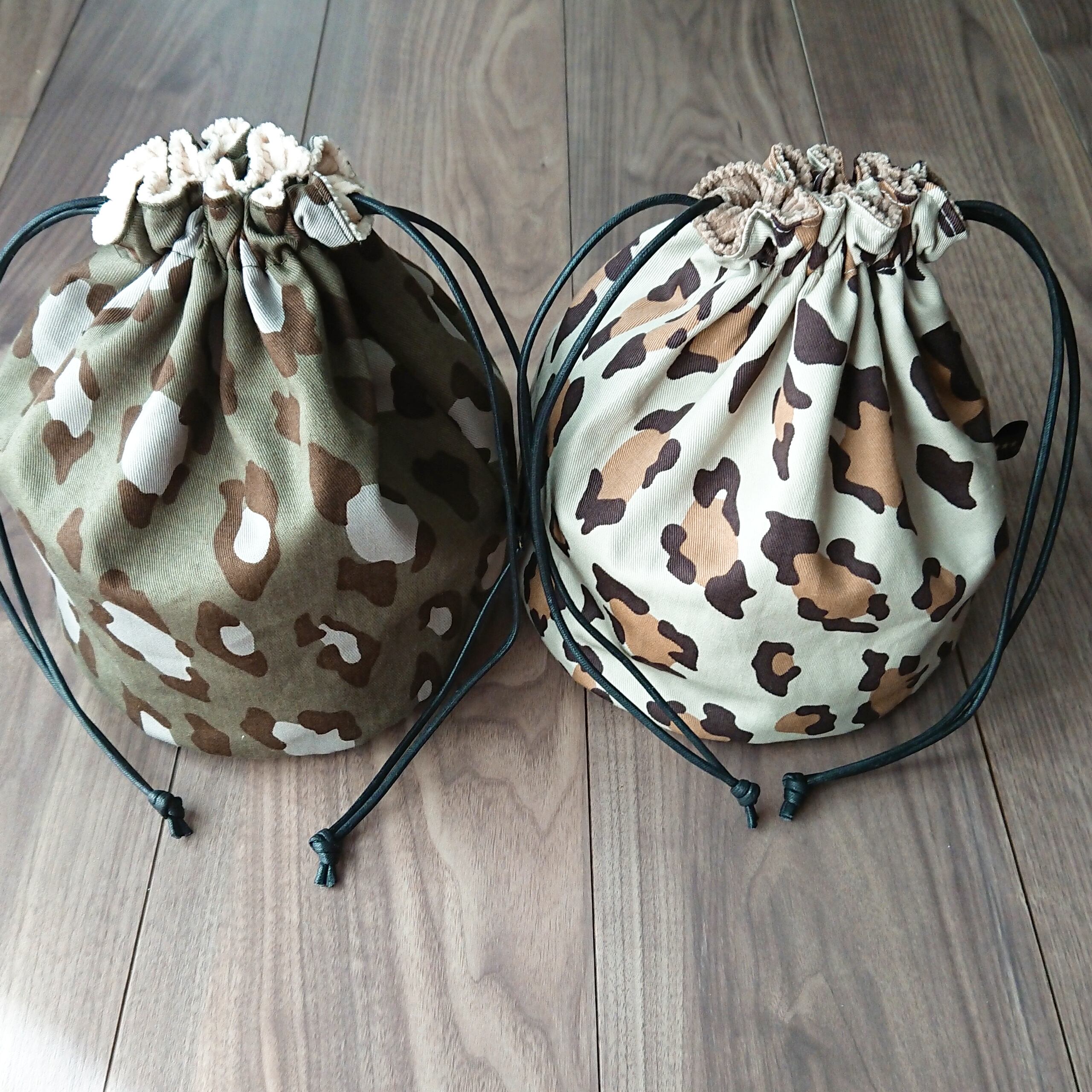 リバーシブル丸底巾着 カーキレオパ